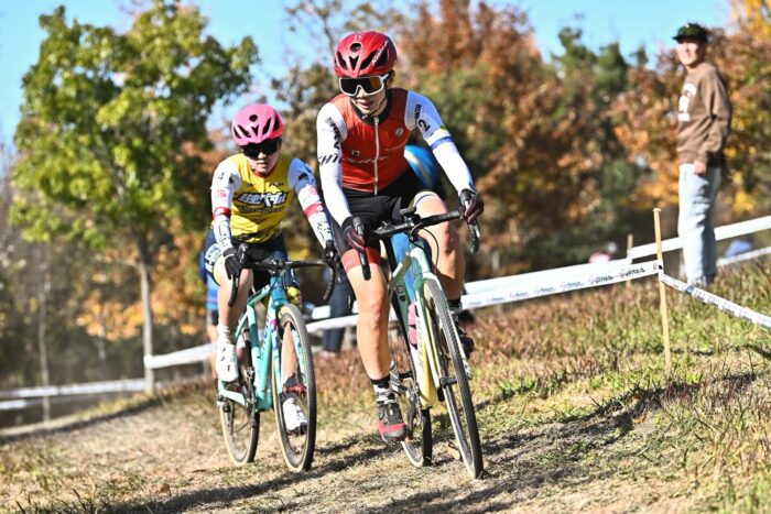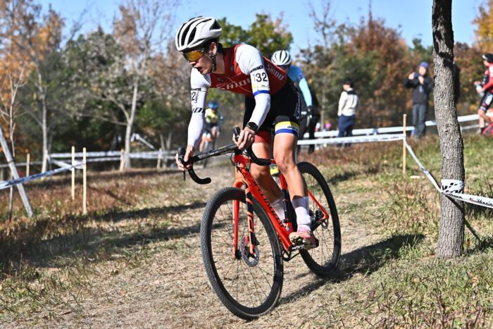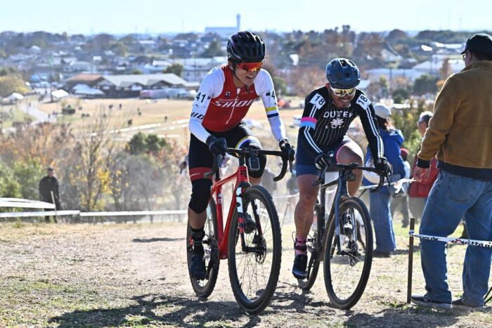 大きな丘が特徴的な会場で、丘を登り、丘を下るレイアウトは昨年と大きな変更なし。昨年は登りが直登気味だったのが今年は少し九十九折り気味になって斜度が緩まったのと、上りの回数が昨年よりも若干減った印象。コンデションは昨年が大会数日前に振った雨の影響でメインエリア付近が泥どろだったのが、今年は完全にドライ。丘の下りも乾いてフカフカになっている箇所が増えていました。逆バンク気味のコーナーが多いので、勢いだけで攻めてしまうと落車リスクがあるので、注意が必要です。