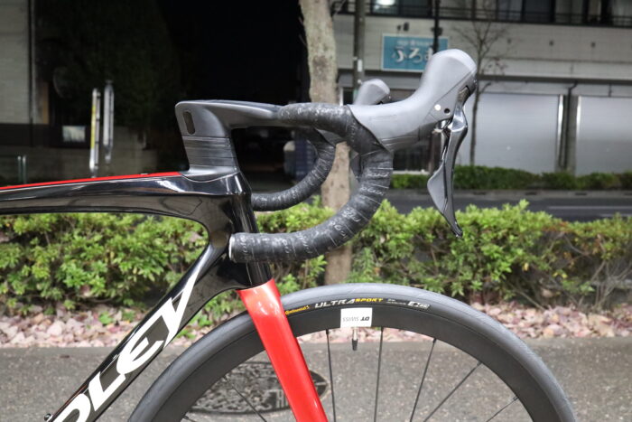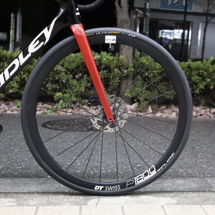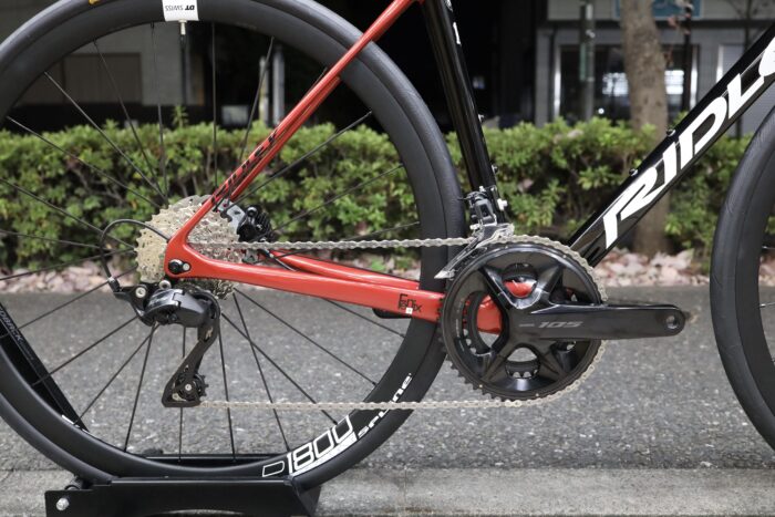 2×12速のシマノ105のフルセットとDT SWISS P1800SPLINEホイールセットを組み付け、さらにWAKO‘Sバリアスコートリキッドを施工してビカビカに仕上げた1台です。